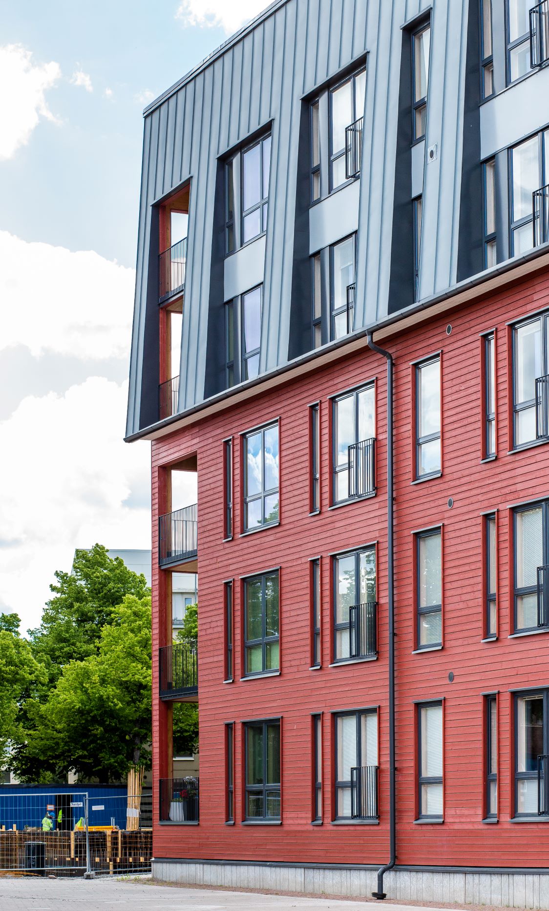 Julkisivuissa on palonsuojakäsittely B-s2, d0 1.kerroksen julkisivupinnoissa sekä varateiden ylä- ja alapuoliset julkisivupinnoissa. Parvekkeen seinä- ja kattopinnat B-s2, d0 (palamaton julkisivulevy, tai palonsuojakäsitelty puuverhous). Pystysuunnassa leviävä palo estetään tuuletusraon palokatkoprofiileilla. Kallistetun peltijulkisivun osuudelta julkisivupinnan taustalla olevassa tuuletusraossa sivuttaissuuntainen palon leviäminen estetään huoneistojen välillä tuuletustilan pystysuuntaisella osastoinnilla. Julkisivun tuuletusväli sekä yläpohjan ontelo on osastoitu erilleen toisistaan.