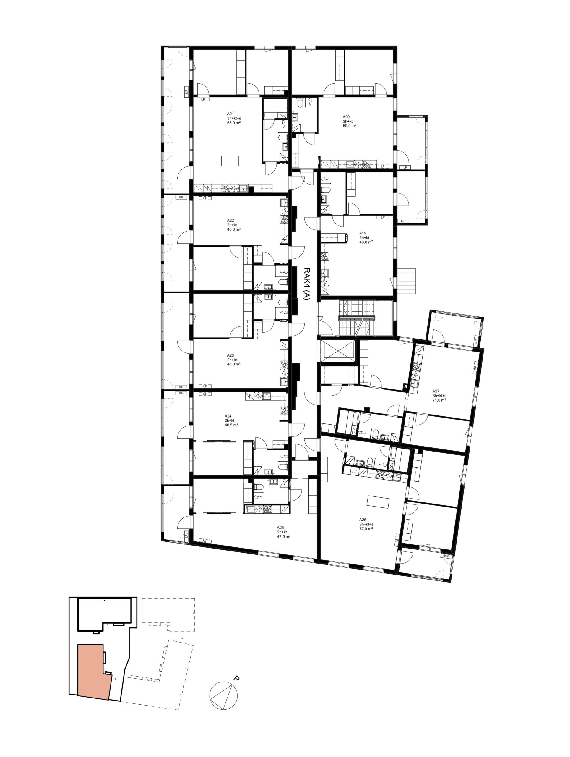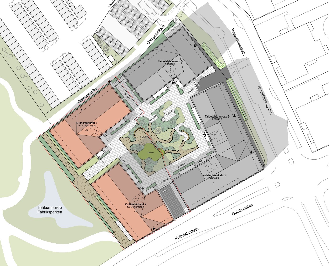 Kortteli rakentuu kaupunkimaisena ja selkeärajaisena kokonaisuutena, jonka kulmat sulkeutuvat ympäröivään katuverkkoon. Pysäköinti sijoittuu pihakannen alle, ja sen yläpuolelle nousevat 5–7-kerroksiset asuinrakennukset. Rakennusten erityispiirteenä on ylimpien kerrosten parvitaso, joka hyödyntää harjakaton alla olevaa lisätilaa.